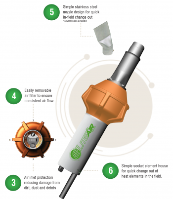 Der doppelt isolierte Griff des EliteAIR Industrial sorgt dabei für die nötige Arbeitssicherheit. Mit 1,1 kg Gewicht eignet sich das Gerät auch für einen längeren Arbeitseinsatz. Durch das puristische Design ist ein schneller Austausch von Heizelementen oder Edelstahldüsen vor Ort gewährleistet.