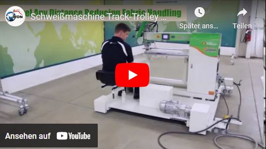 Das T-300 Travelsystem wurde speziell für die Herstellung großer langen Bahnen konzipiert. Die Basisschweißmaschine „T-3oo“ ist auf einem fahrbaren Untersatz montiert. Ein synchronisiertes Antriebssystem bewegt die gesamte Maschine an einem Tisch entlang. Hierdurch lassen sich selbst XXL-Planen mit nur einer Person verarbeiten. Ein Schienensystem sorgt dafür, dass Sie immer in der Spur bleiben.
