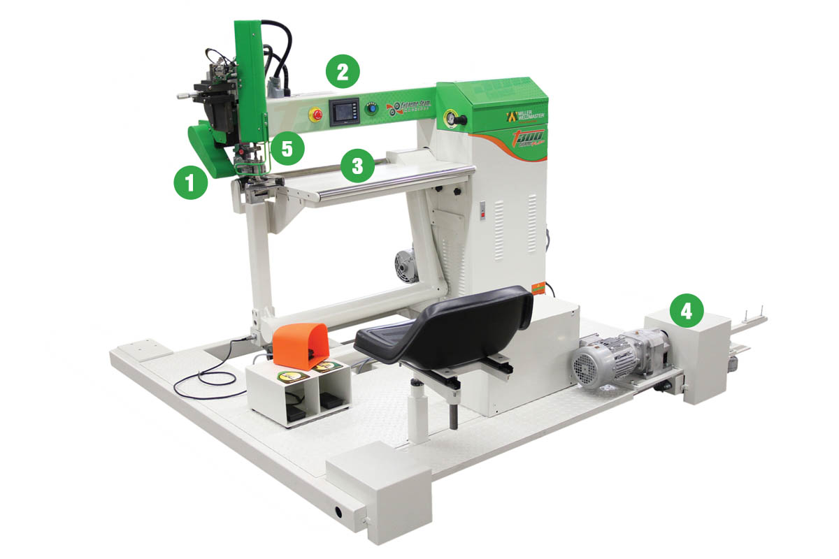 Die flexible Schweißmaschine Miller T-300 verfügt über eine Wandelarbeitsbereich (Fläche, Säule und Armabwärts), Touchscreen Bedienfeld mit Rezeptverwaltung, differenzierbaren Transportrollen, intelligente Temperatursteuerung, zuschaltbare zusätzliche Vorschubrolle, Apparatschnellwechselsystem und einem Armdurchgang von 838 mm. Die Maschine kommt wahlweise in Heißluft- oder Heizkeilausführung. Werkseitig ist die Maschine mit einer 1″ (25,4mm) Arbeitsgarnitur und einem Führungsapparat für Überlappungsnähte ausgestattet. Andere Arbeitsgarnituren sind optional erhältlich von 10mm bis 50mm.